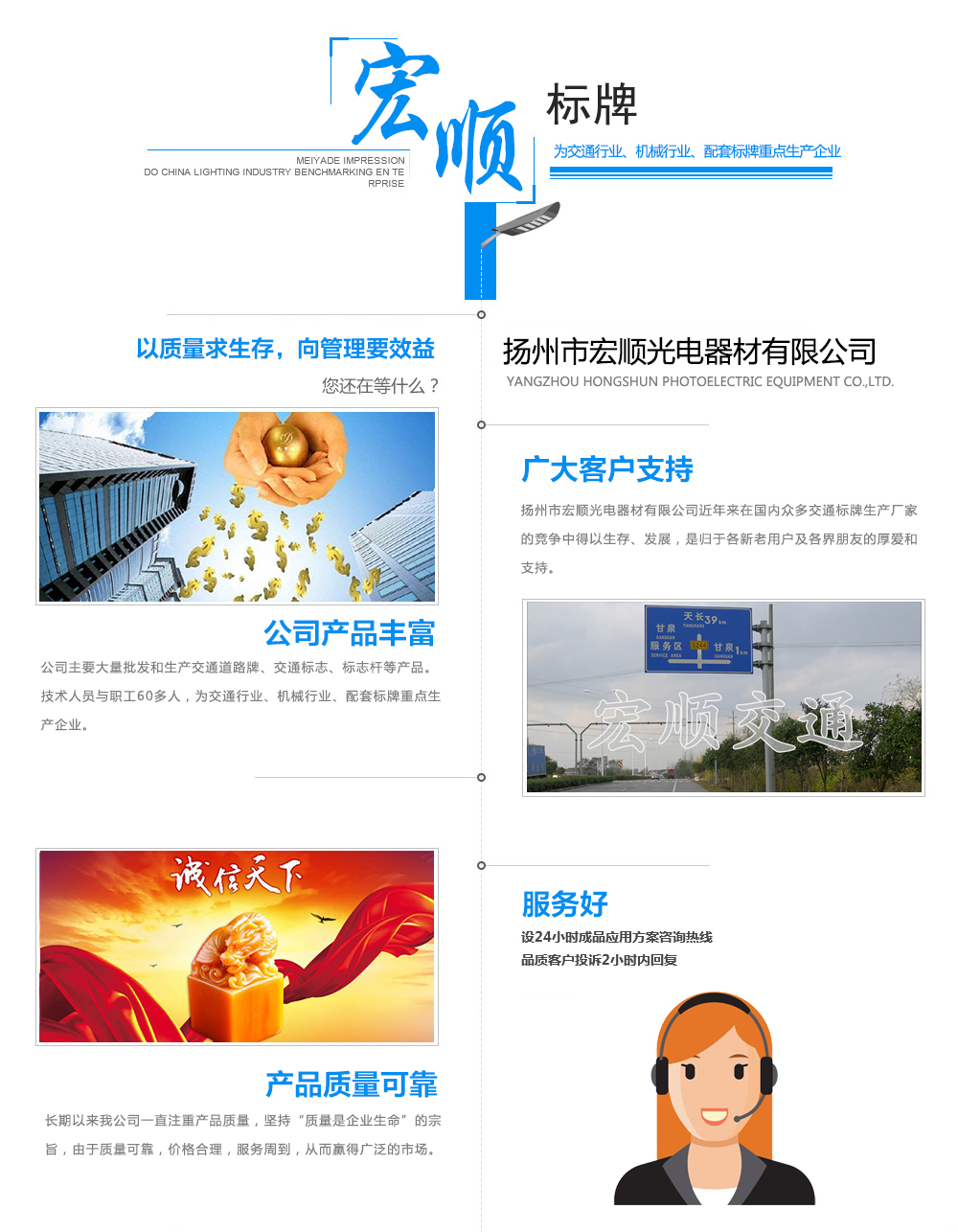 揚(yáng)州市宏順光電器材有限公司近年來(lái)在國(guó)內(nèi)眾多交通標(biāo)牌生產(chǎn)廠家的競(jìng)爭(zhēng)中得以生存、發(fā)展,是歸于各新老用戶及各界朋友的厚愛(ài)和支持。我們?nèi)w員工向你們致以誠(chéng)摯的感謝。 為使我們共同步入新世紀(jì),提高我們的產(chǎn)品質(zhì)量與服務(wù)希望對(duì)我們提出寶貴的意見(jiàn),使我們不斷改進(jìn)、創(chuàng)新。 我們將和過(guò)去一樣,視今天的質(zhì)量為明天的市場(chǎng)。為您奉獻(xiàn)滿意的各種精品,為美化我們的交通事業(yè)做出貢獻(xiàn)。 公司主要大量批發(fā)和生產(chǎn)道路交通標(biāo)志牌、道路指示牌、交通標(biāo)志牌、指路牌、反光標(biāo)志牌等產(chǎn)品。技術(shù)人員與職工60多人,為交通行業(yè)、機(jī)械行業(yè)、配套標(biāo)牌重點(diǎn)生產(chǎn)企業(yè)。 長(zhǎng)期以來(lái)我公司一直注重產(chǎn)品質(zhì)量,堅(jiān)持“質(zhì)量是企業(yè)生命”的宗旨,由于質(zhì)量可靠,價(jià)格合理,服務(wù)周到,從而贏得廣泛的市場(chǎng),近年來(lái)隨著交通事業(yè)的開(kāi)發(fā)和研究,傾聽(tīng)用戶的意見(jiàn),使得我們?cè)谑袌?chǎng)競(jìng)爭(zhēng)中不斷發(fā)展壯大。 我們本著“質(zhì)量可靠、信譽(yù)優(yōu)先、用戶至上”的宗旨,“以質(zhì)量求生存,向管理要效益”的信條,竭誠(chéng)為... ...【查看更多】